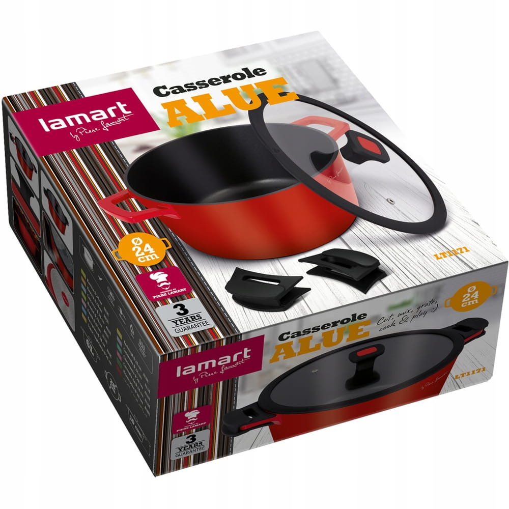 Wyprodukowano z wysoce odpornego lanego aluminium. Garnek z powierzchnią wewnętrzną odporną na zadrapania i przypalanie, z grubym dnem i lanymi nierdzewnymi uchami z osłoną silikonową. Nieprzywierający materiał bez zastosowania PFOA (w przypadku przegrzania nie uwalniają się żadne toksyczne substancje) o wysokiej odporności termicznej, przeciwdziała przypalaniu, zdrowe gotowanie. Pokrywka z odpornego szkła z otworem na parę i silikonową krawędzią, zapewniająca doskonałą kontrolę podczas gotowania. Łatwa konserwacja i czyszczenie.