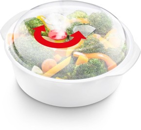 - Wielofunkcyjne, wytrzymałe naczynie plastikowe przeznaczone także do podgrzewania w kuchence mikrofalowej, naczynie posiada szczelne wieczko z wentylacją pary i kratką pary.