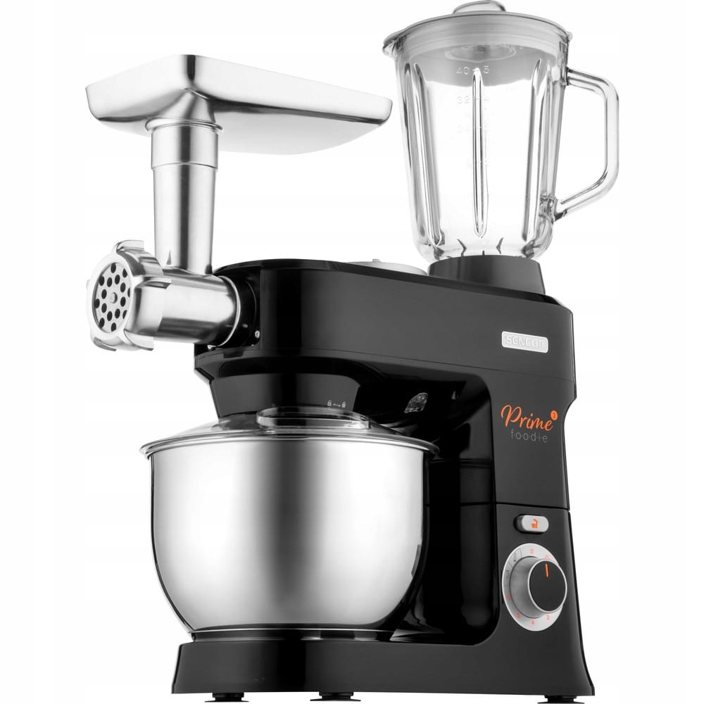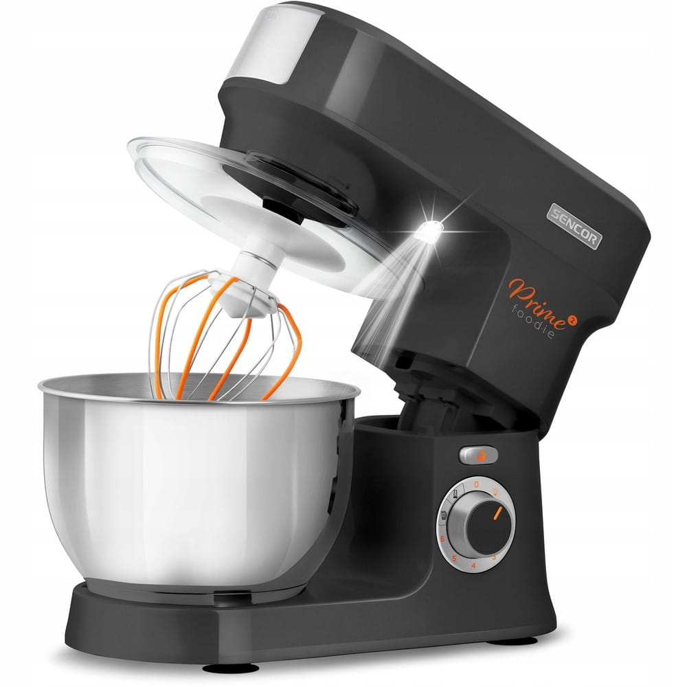 Robot kuchenny planetarny SENCOR STM 3761BKo mocy 1000W, posiada 6 stopni prędkości, funkcja pulseoraz 2 programy NutriSmart. W zestawie znajdziemy pojemne 4,5lnaczynie ze stali nierdzewnej do wszystkich rodzajów ciast (0,8 kg ciężkie ciasta, 2,2 l delikatne ciasta), do mieszania dołączono 4 trzepaczki flexi,ponadto robot posiada unikatowe oświetlenie LEDktóre pozwala kontrolować konsystencję ciasta. Maszynka do mięsamoże mielić na grubo lub delikatnie posiada także końcówkę do robienia kiełbasy. Robot wyposażony jest także w3 końcówki do robienia makaronu.