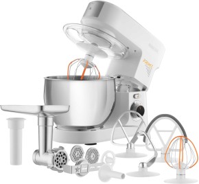Robot kuchenny planetarny marki SENCOR o mocy 1000 W umożliwia przygotowanie rozmaitych potraw, w tym różnego rodzaju ciast, dzięki zestawowi 4 różnych końcówek mieszających. Urządzenie dysponuje 6 stopni ustawienia prędkości, funkcję PULSE oraz 2 programy NutriSmart. Obsługa urządzenia jest intuicyjna dzięki unikalnym rozwiązaniom, takim jak oświetlenie LED wnętrza naczynia.