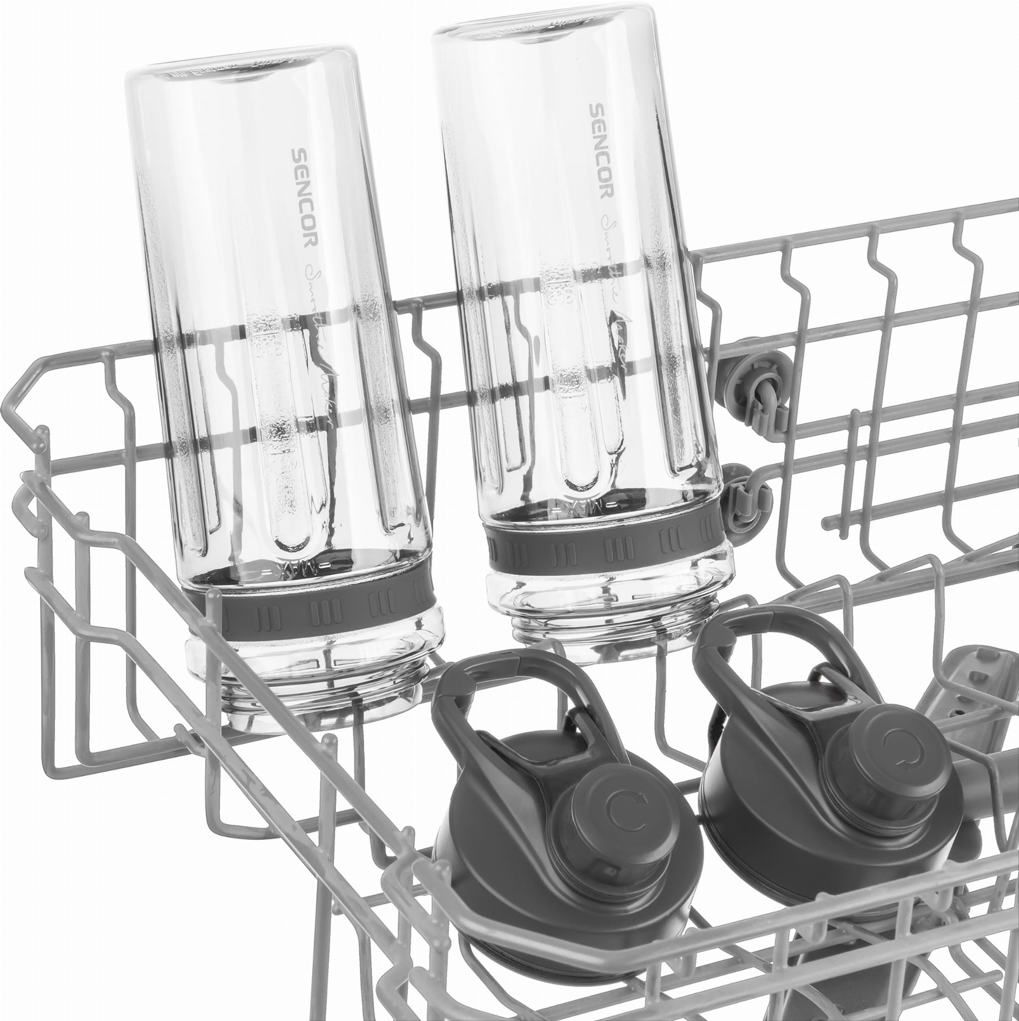 Szklanki, pokrywki i noże można również myć w zmywarce. Butelki nie zawierają BPA, więc nie musisz się martwić o uwolnienie niebezpiecznych substancji.