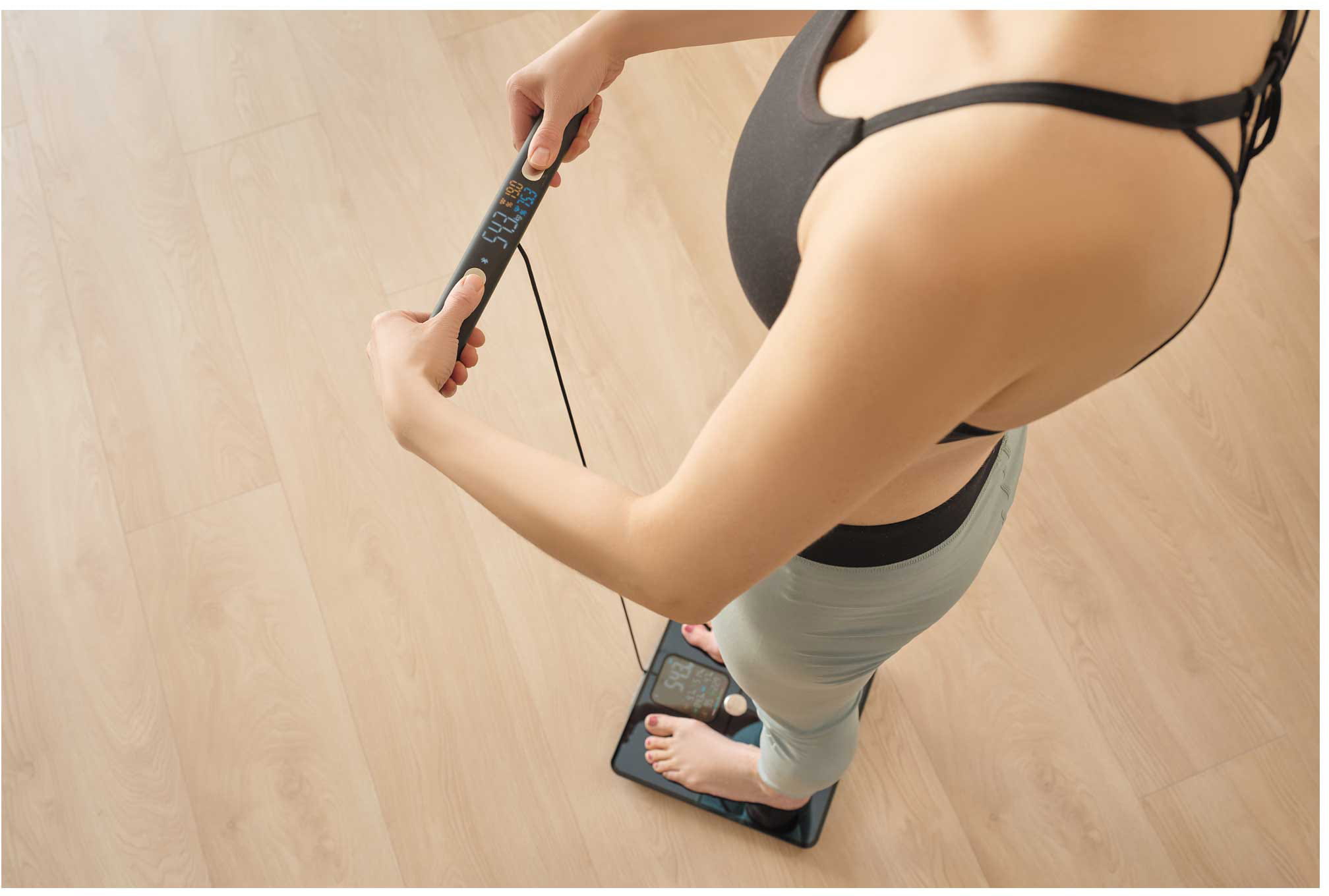 - Oblicza BMI, % tkanki tłuszczowej, % wody, % mięśni, % kości