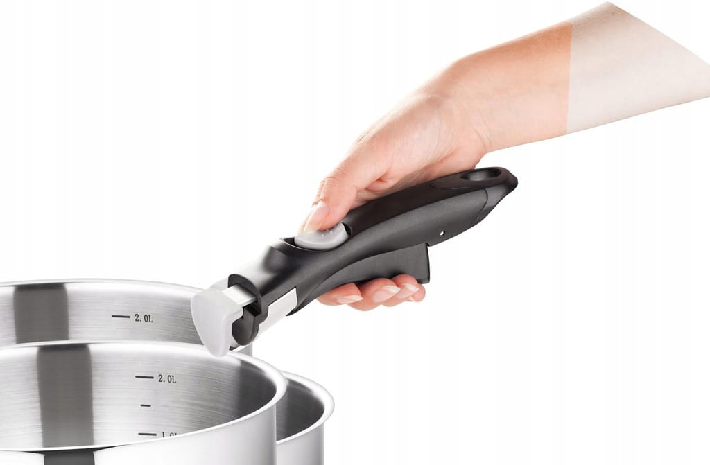 Naczynie nierdzewne o nowoczesnym wzornictwie, wyprodukowane ze stali nierdzewnej pierwszej klasy, wyposażone w grube dno kanapkowe i niezwykle elegancką zdejmowaną rękojeść zapewniającą większą kompaktowość naczynia